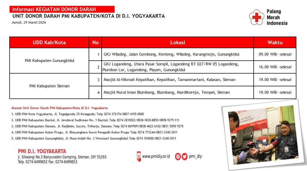 Written by: Warjiyani 29 March 2024 Beberapa tempat donor darah yang bisa Anda kunjungi hari ini, Jumat, 29 Maret 2024